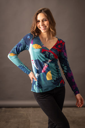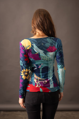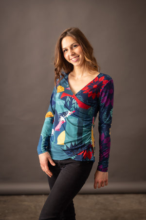 Tee-shirt manches longues tout imprimé à une double couche sur le devant pour un effet cache-coeur. Sa coupe ajustée apporte de la féminité à la silhouette . La placement des motifs asymétrique apporte aussi de l'originalité .