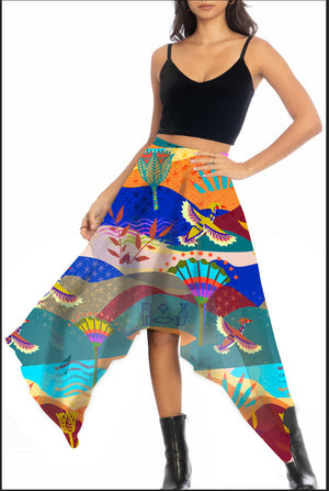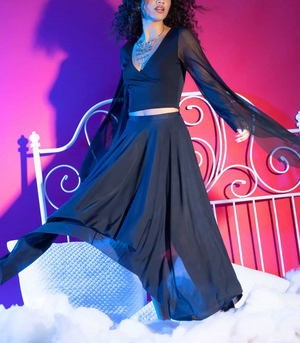 Cette nouvelle jupe en résille à la coupe asymétrique, joue sur la légèreté et les transparences pour une silhouette aérienne et moderne. Doublée au genou