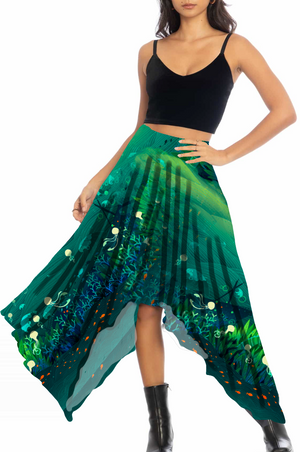 Cette nouvelle jupe en résille à la coupe asymétrique, joue sur la légèreté et les transparences pour une silhouette aérienne et moderne. Doublée au genou
