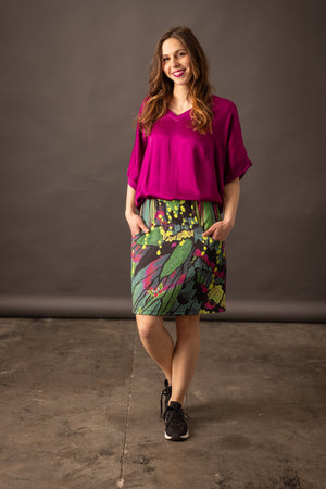 Cette jupe droite en maille est agrémentée de poches, elle saura convaincre toutes les morphologies grâce à sa matière extensible.