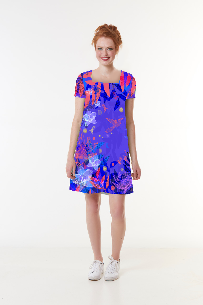 On retrouve le col de la robe DAKOTA de l’hiver dernier sur une base de SANDRA et ORFEO avec des poches .  Style et confort avec ce modèle évasé, manches courtes, tout imprimé . On aime sa maille légère qui donne de l'éclat aux couleurs.C'est la maille de la robe Nadine, NADIA, SANDRA, un jersey souple .