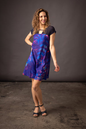 Two-material dress with short sleeves. The upper part is in plain mesh and decorated with a drop. From the chest, the dress is in fully printed crepe. We like the slight transparency for the touch of femininity and the straight cut that suits all figures.