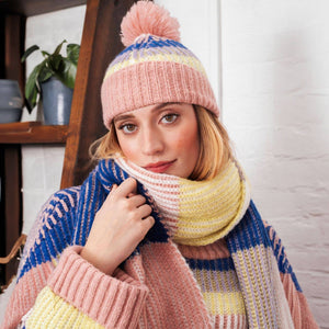 Phoebe est votre pop pastel d'hiver 💗. Conçue par Cara avec des rayures roses, jaune citron et bleues, et un pompon moelleux sur le dessus, elle est confortable, ludique et parfaite pour une tenue d'hiver joyeuse.