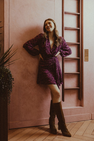 Il s'agit d'une robe courte avec une encolure en V façon cache-coeur et des manches longues. Cette robe est ornée d'un charmant imprimé fleuri qui lui confère une touche de fraîcheur et de féminité. Pour mettre en valeur la taille, elle est agrémentée d'un nœud élégant.