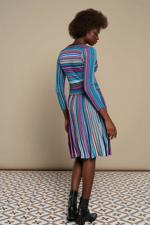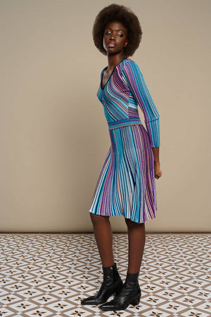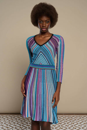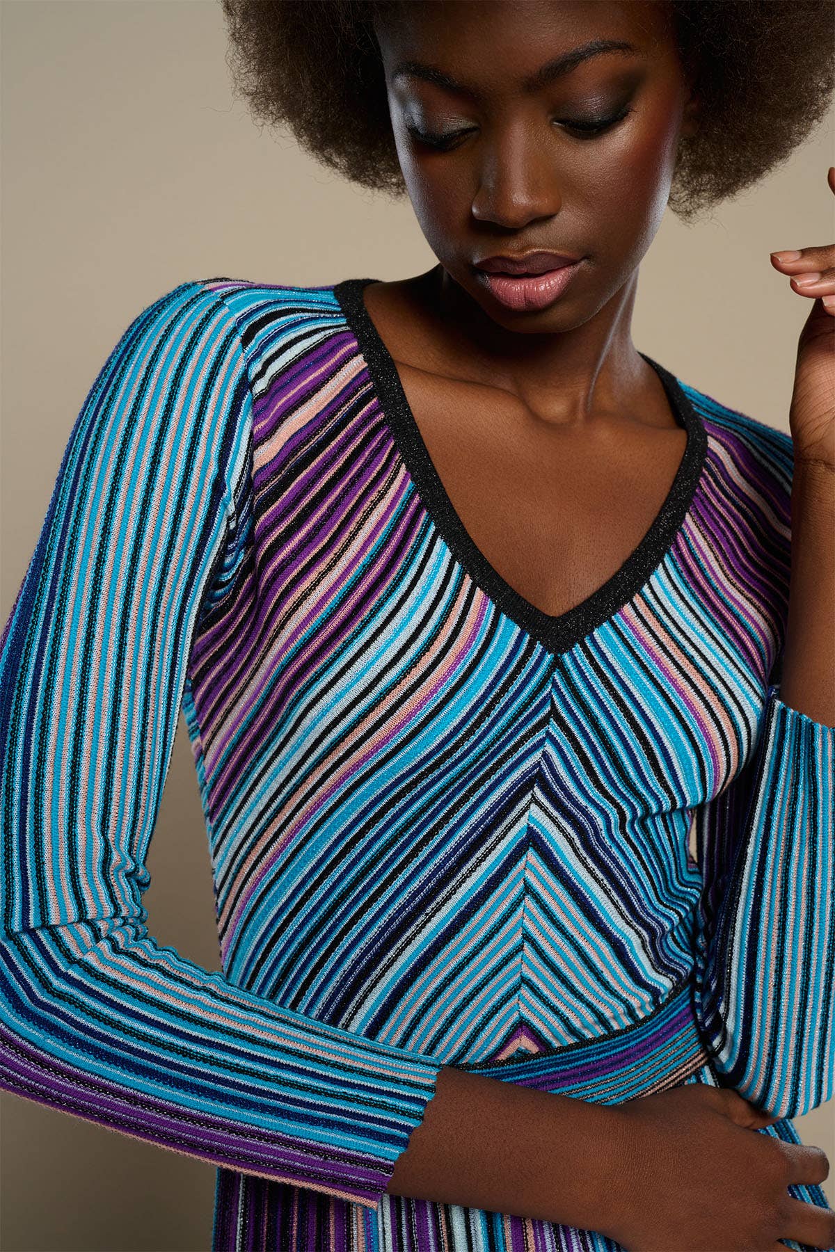 Robe à col en V et manches longues. Cintrée à la taille. Jupe évasée. Imprimé zigzag. Tissu extensible. Le mannequin mesure 1,81 m et porte la taille S.