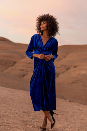 Cette robe en velours offre un mélange de fluidité et de confort. Elle présente un col en V flatteur et des manches 3/4. La coupe est ajustée à la taille, soulignant ainsi la silhouette, et elle met en valeur la poitrine grâce à un élégant drapé.
